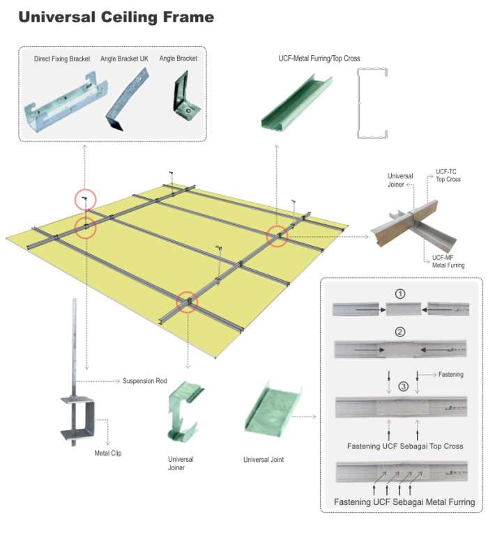 Ceiling Frame The main advantages of the Ceiling Frame are: Avoids losses caused by termites. Easy installation with complete supporting accessories. Uses one profile type for dual functions: Metal Top, Cross, and Furring. Profile and structural strength have been tested to ensure durability.