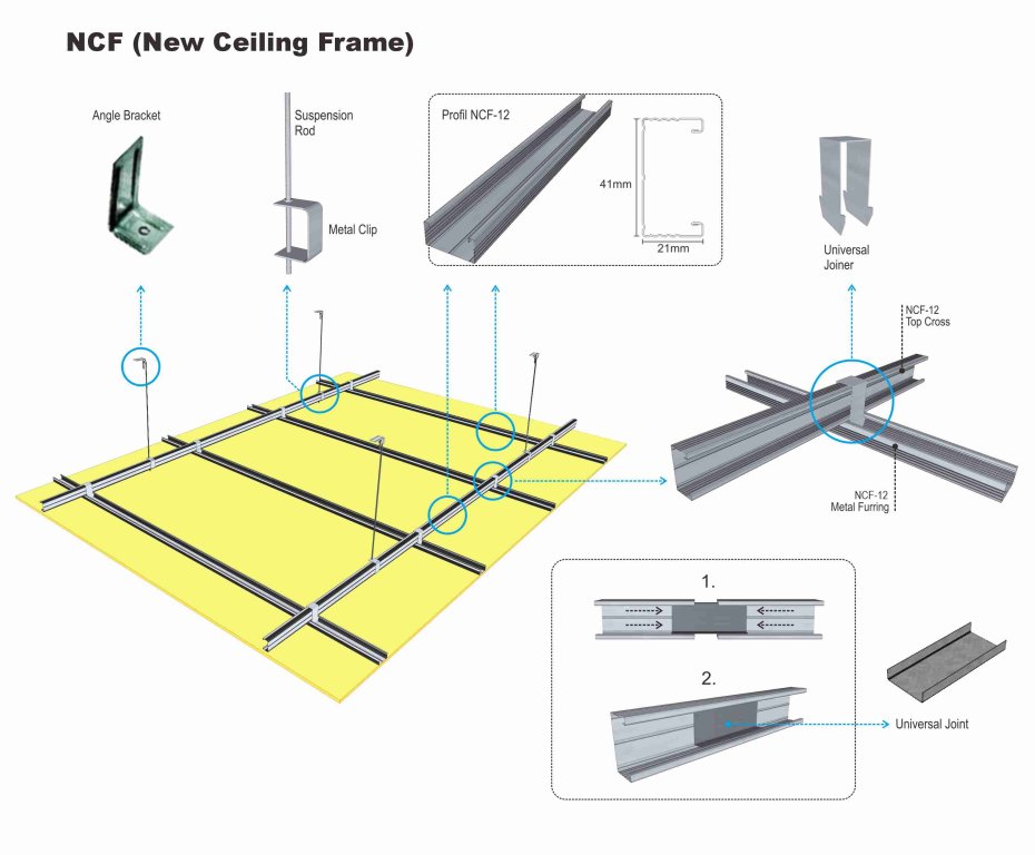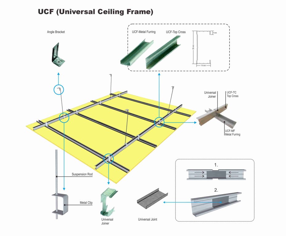 Ceiling Frame Keunggulan utama Ceiling Frame: Terhindar dari kerugian akibat serangan rayap. Mudah dipasang karena didukung aksesoris lengkap. Menggunakan satu jenis profil untuk dua fungsi: Metal Top, Cross, dan Furing. Profil dan struktur telah melalui pengujian kekuatan.